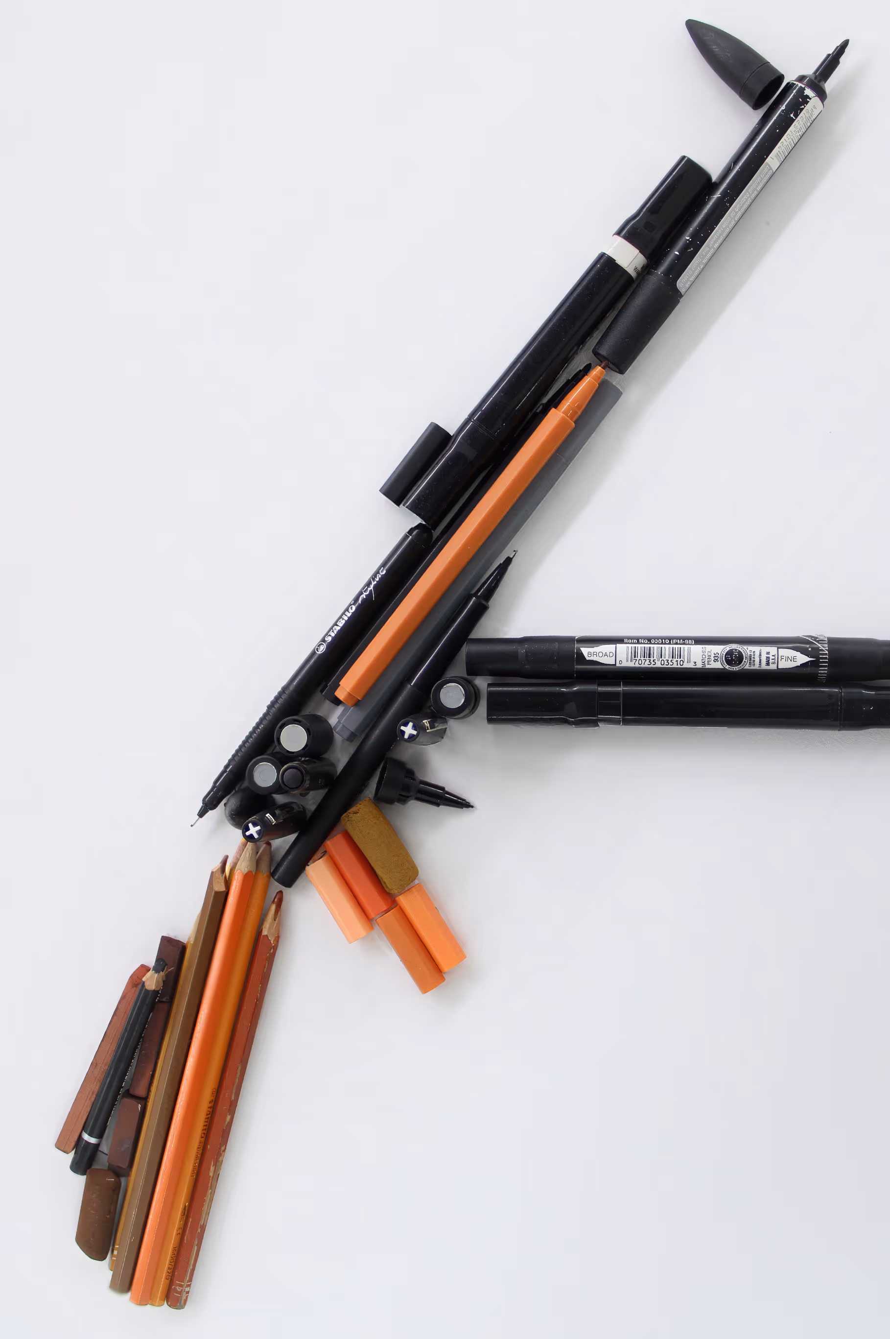 The weapon is carefully composed from pencils and markers — instruments of creativity — forming a precise and disarming trompe-l’œil. By reimagining a tool of destruction through the lens of creation, the piece asserts a quiet but powerful stance: to create is to resist.